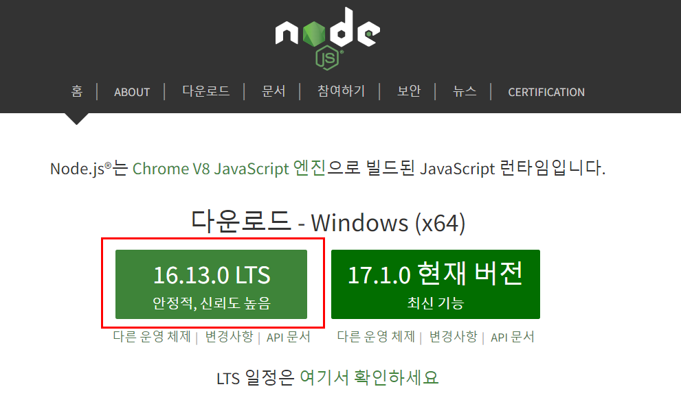 저는 안정화된 버전을 신뢰하기에 왼쪽에 있는 LTS를 설치하는 것을 추천합니다.