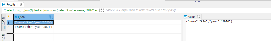 ROW_TO_JSON은 한 행을 json형태로 만든 것으로 하나의 칼럼에 한 로우(row)씩 들어가 있다.