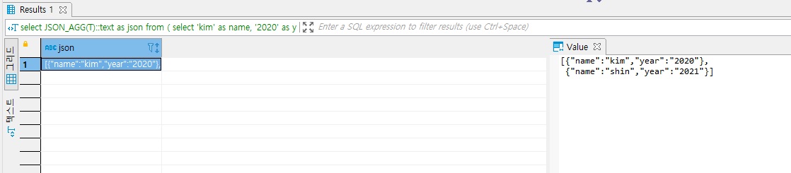 JSON_AGG은 한 행을 json형태로 만들고 하나의 칼럼에 모든 로우(row)가 배열의 형태로 들어가 있다.