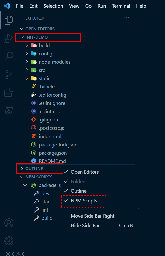 VSCode에서 프로젝트 폴더나 outline부분(빨간색 선 사각형)에 우클릭하면 작은 창이 뜹니다. 해당 창에서 NPM Script를 클릭하면 NPM Script가 왼쪽 탭에 생깁니다.