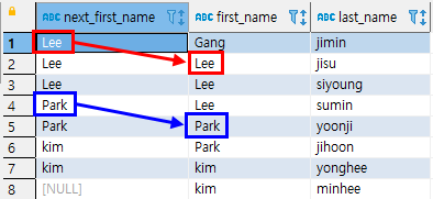 select lag(last_name, 1) over (partition by first_name order by first_name) as pre_first_name, first_name, last_name
