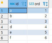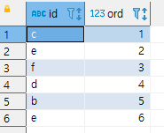 INNER join UNNEST(ARRAY['c','e','f','d','b','e']) WITH ordinality t2(id, ord) USING(id)
